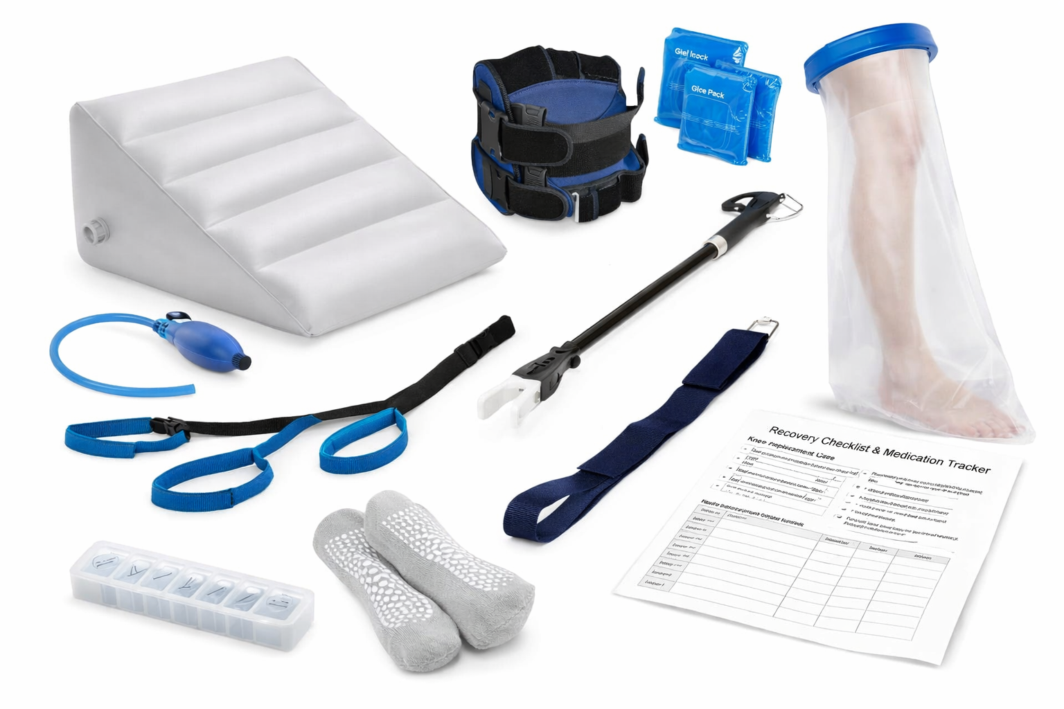 Complete knee replacement recovery kit with leg lifter, elevation wedge, ice therapy, grabber, socks, shower cover, pill organizer, and recovery tracker.